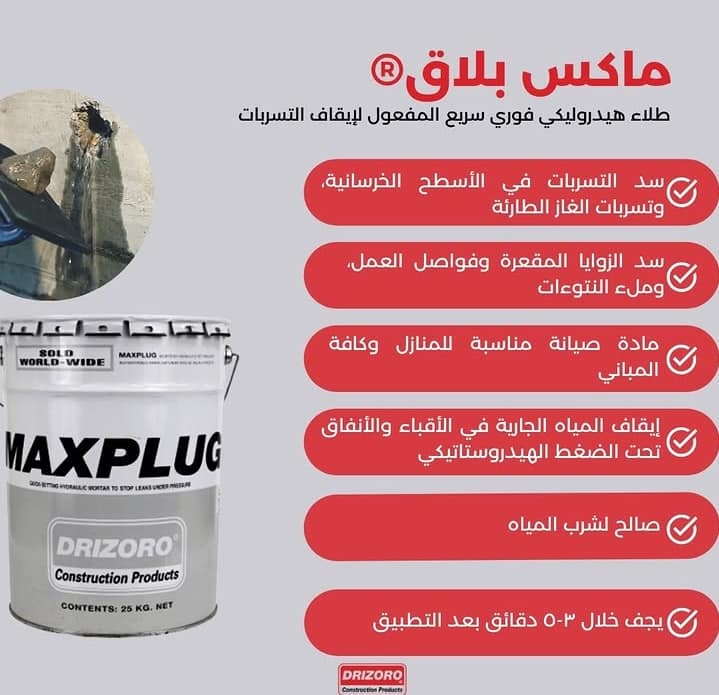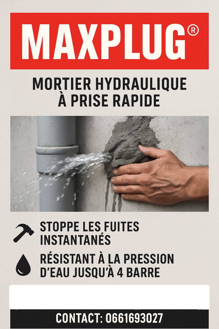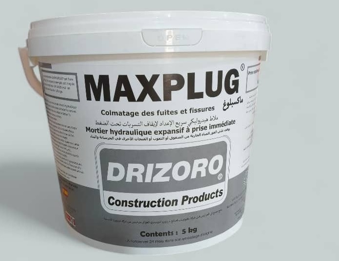 MAXPLUG Mortier a base de ciment hydraulique légerement expansif a prise rapide (3 a 5 minutes) apret sa prise, il forme corps avec le support. Stoppe instantanément leau provenant de lézardes, fissures ou ouvertures formes dans le béton ainsi que sur d'autres supports.